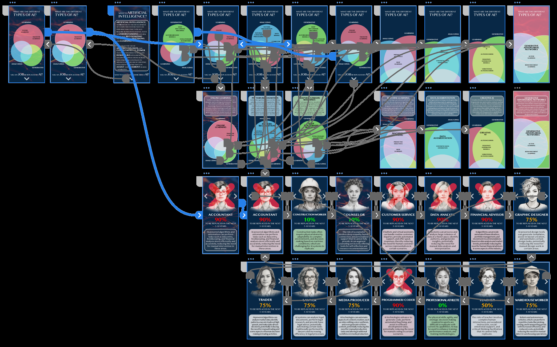 The user starts with a description of what Artificial Intelligence is. They are then able to view a diagram of the various types of AI. Then they are able to see various jobs and how likely (and why) AI will affect them.