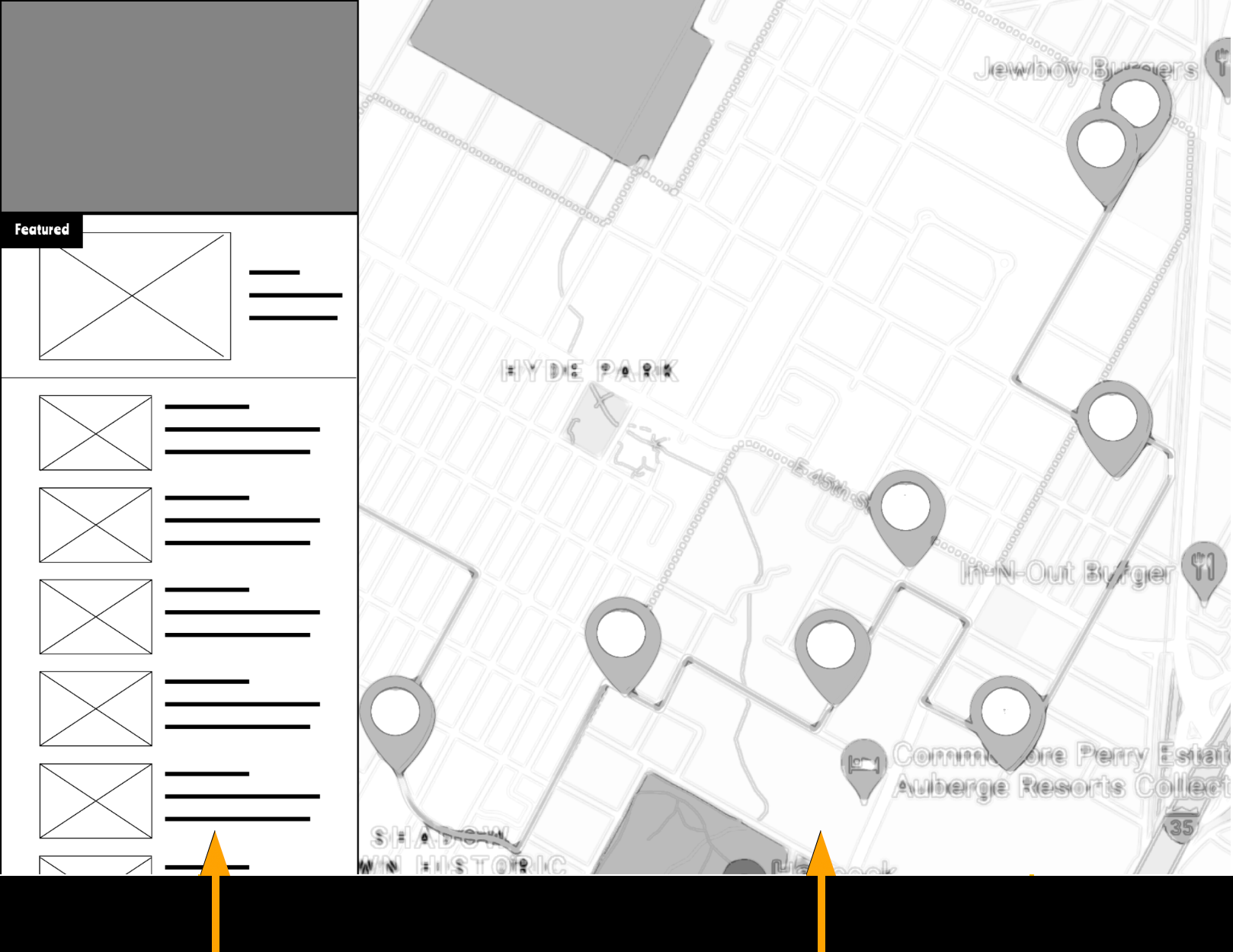 The two main parts will be the map and the list. These two components will help users discover vintage vehicles, homes and businesses; either by locating on the map or by exploring the comprehensive list.
